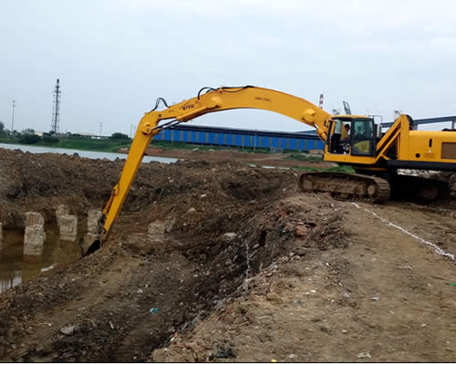 全液壓超長臂挖機(jī),馳騁在河道清淤、溝渠挖掘工地中